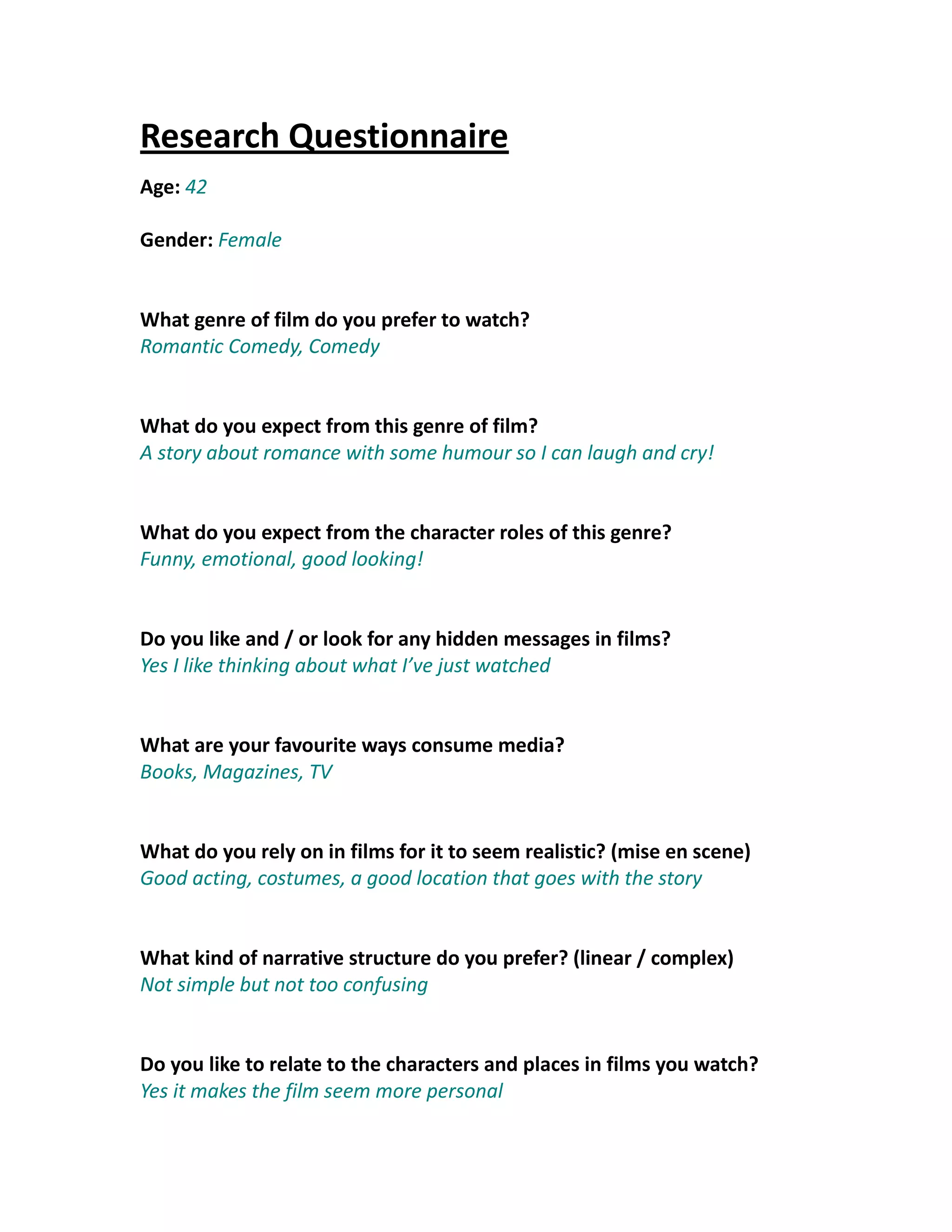 A 42-year old female who enjoys romantic comedies and expects them to tell a romantic story with humor that makes her laugh and cry. She wants the character roles to be funny, emotional, and good looking. She likes analyzing films for hidden messages after watching and consumes media through books, magazines, and television. For films to seem realistic, she relies on good acting, appropriate costumes, and locations that fit the story. She prefers narrative structures that are not too simple or confusing and likes to relate to characters and places in films to make the viewing experience feel more personal.