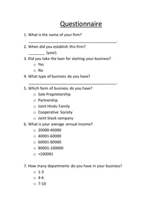 This document is a 12 question questionnaire for a business owner that asks for information such as the name of their firm, year established, business type, legal structure, annual income, number of departments, tax payment practices, customer billing practices, social responsibilities, employee bonuses, product returns, and loan preferences for high investments.