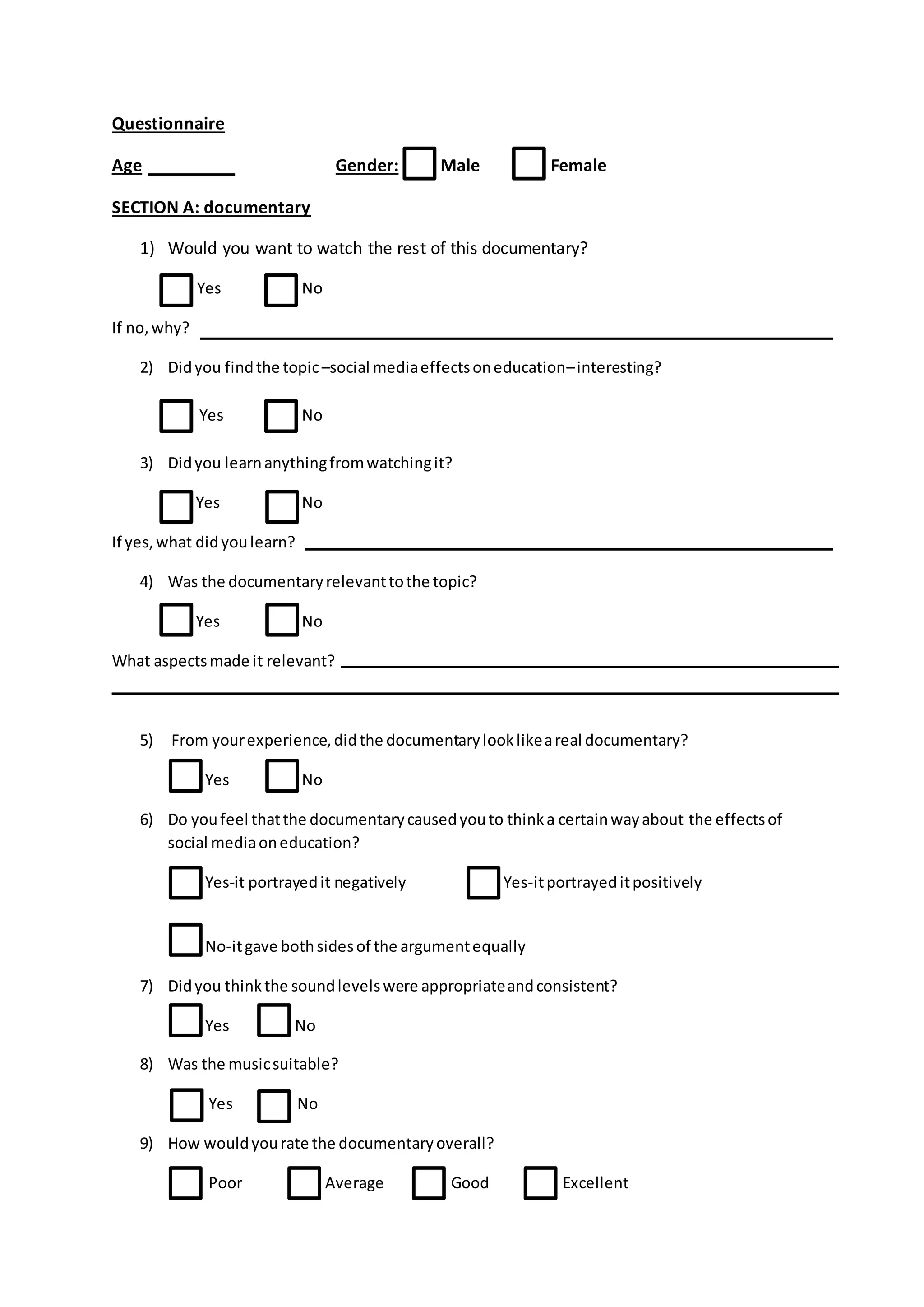 This document contains a questionnaire about a documentary on the effects of social media on education. It asks questions to gauge the respondent's reactions to different parts of the documentary, including whether they found the topic interesting, what they learned, and if they think the documentary portrayed its argument positively or negatively. It also contains similar questions about a radio trailer and TV guide article advertising the documentary, assessing if these would encourage watching the documentary and which elements were most effective. Finally, it asks if the respondent sees a clear link between the different promotional products.