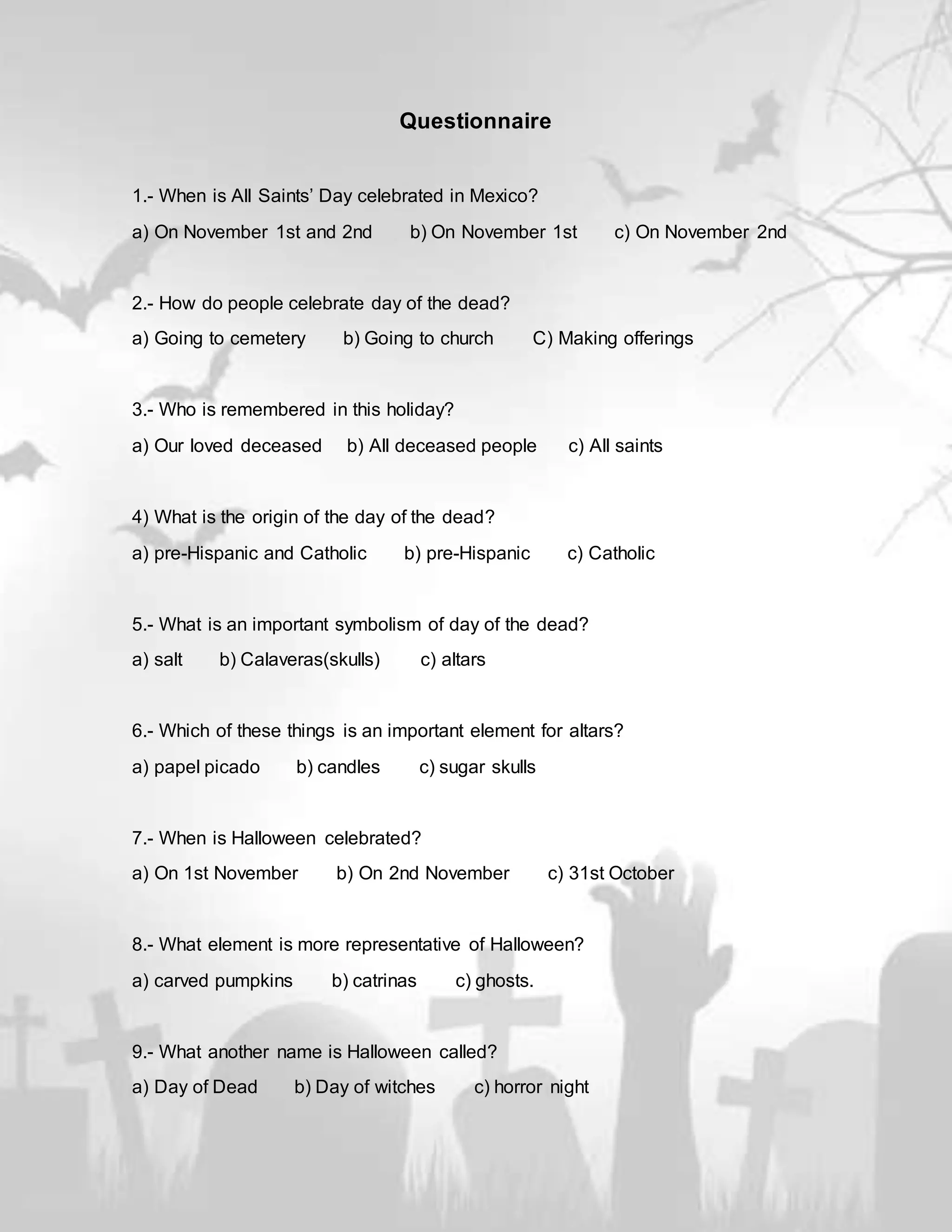 This document is a 12 question multiple choice questionnaire about the holidays of Day of the Dead and Halloween. It asks about the dates each are celebrated, traditions and symbols associated with each, their origins, and superstitions related to Halloween. Key details covered include Day of the Dead being celebrated November 1st and 2nd in Mexico to remember deceased loved ones, and Halloween originating from Celtic traditions and being celebrated on October 31st.