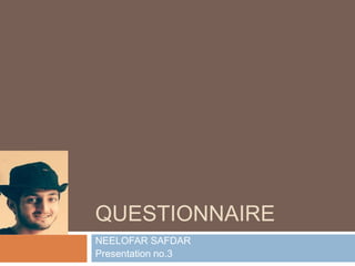 This document discusses questionnaires as a research instrument in survey research. It defines questionnaires and describes their key characteristics, functions, types, and how they are used to measure variables. It also outlines the steps to construct a good questionnaire, including deciding what information is needed, defining the target respondents, choosing an administration method, writing question content and wording, determining length, and pre-testing the questionnaire. Questionnaires are used to collect factual information through a set of predetermined questions and can be fixed-response or open-ended.