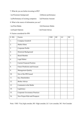 The document appears to be a survey or questionnaire about factors that influence investors' decisions to invest in initial public offerings (IPOs). It asks respondents for their demographic information and seeks to understand what factors such as company reputation, management quality, and financial prospects they consider strongly, moderately, or not at all when evaluating IPOs. It also asks about their experience levels, preferred sources of information, investment amounts and goals, and any difficulties encountered in the IPO application process. The goal seems to be gathering data on individual investors and what drives their preferences and decision making regarding investing in new stock offerings.