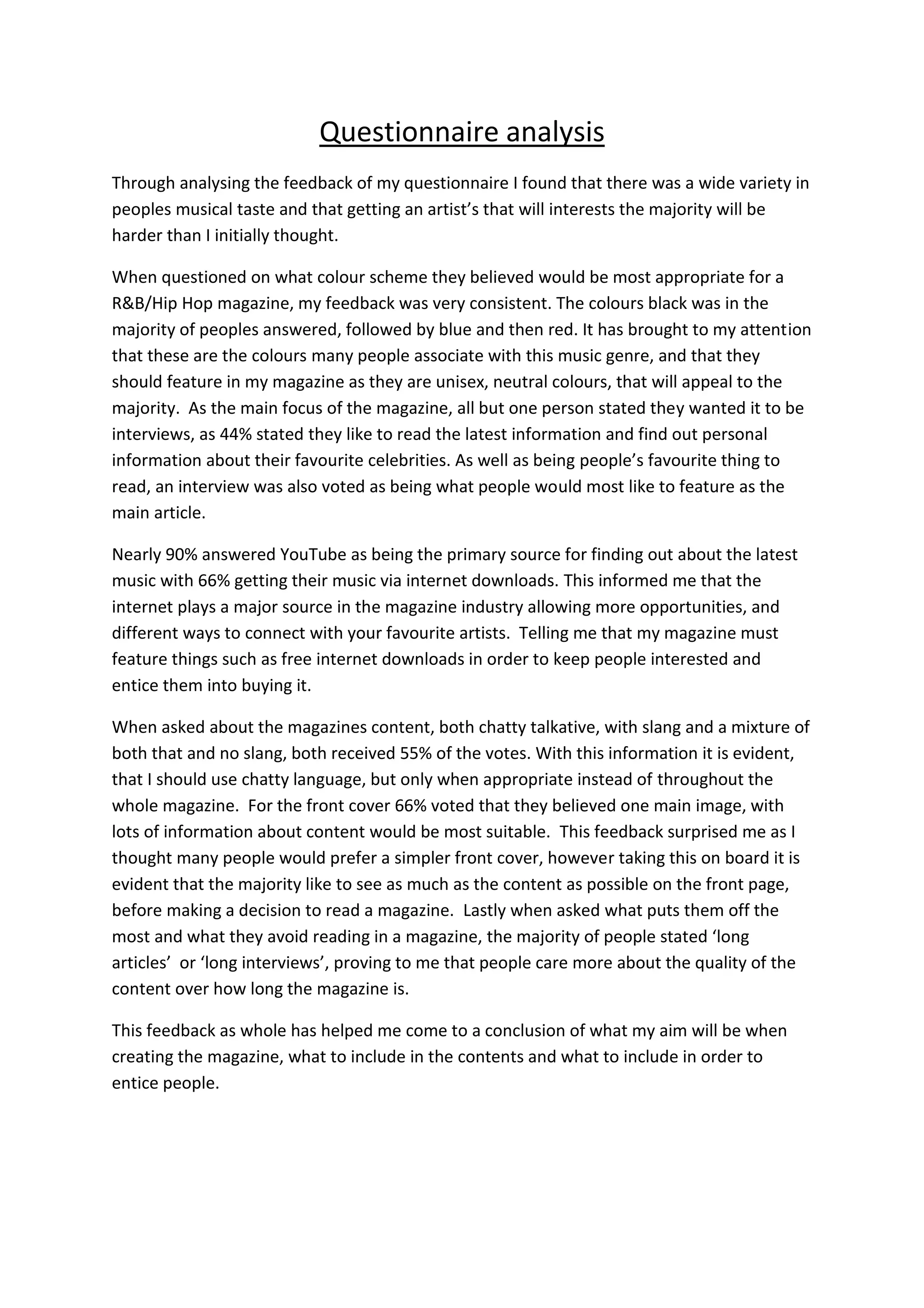 Through analyzing survey responses, the author found that choosing a musical artist that appeals to most readers will be difficult. Respondents consistently said that the magazine's color scheme should feature black, blue, and red. Readers primarily want interviews and information about their favorite celebrities. Nearly 90% use YouTube as their main music source, informing the author that the magazine needs an online presence. While chatty language was preferred by 55%, it should only be used sparingly. The majority want a front cover with lots of content information rather than simplicity. Long articles and interviews were the most off-putting elements. This feedback will help guide the magazine's creation and content.