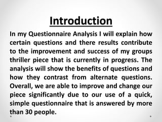 The document summarizes the results of a questionnaire about thrillers given to over 30 people. It analyzes each question to understand what audiences prefer in terms of thriller genres, elements, and time periods. Key findings include that stories and action are the most popular aspects of thrillers, while soundtracks are the least liked. The group decided to focus their thriller piece on these preferred elements, choosing to set an action thriller in modern times based on the questionnaire responses. The analysis of audience preferences helped the group improve their thriller work.
