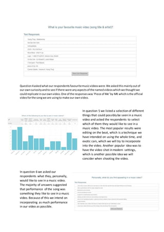 The questionnaire analyzed the target audience for a music video. Most respondents were ages 18-20, male, and listened to house and dance music. These demographics fit the intended target. Respondents favored videos with editing on the beat, exotic cars, and modern settings. Most wanted to see the song's performance in a video. Respondents watched music videos twice a week, validating the responses. Sixty percent preferred a performance video over narrative, which matches the planned video's focus on performance.