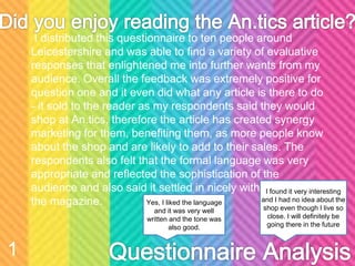 The document summarizes feedback from respondents on various marketing materials created for a magazine called "Leicestershire Living." Overall, the feedback was positive but identified some areas for improvement. Respondents felt the magazine pages were the most successful part but the double page spread could be improved. The radio advertisement was effective at promoting the magazine's content but may have benefited from a more concise and engaging tone.