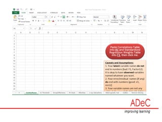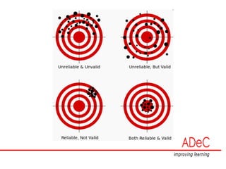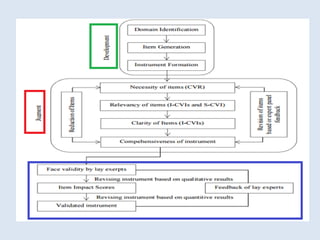 The document discusses the importance of validity and reliability in psychological testing, highlighting various types of validity including content, criterion, and construct validity, as well as their definitions and applications in assessment tools. It emphasizes the necessity for tests to accurately represent the constructs they aim to measure and provides guidelines for ensuring high levels of reliability and validity in assessments. Additionally, it covers methods for developing, adopting, and adapting assessment instruments, while also touching on statistical analyses required to validate constructs.