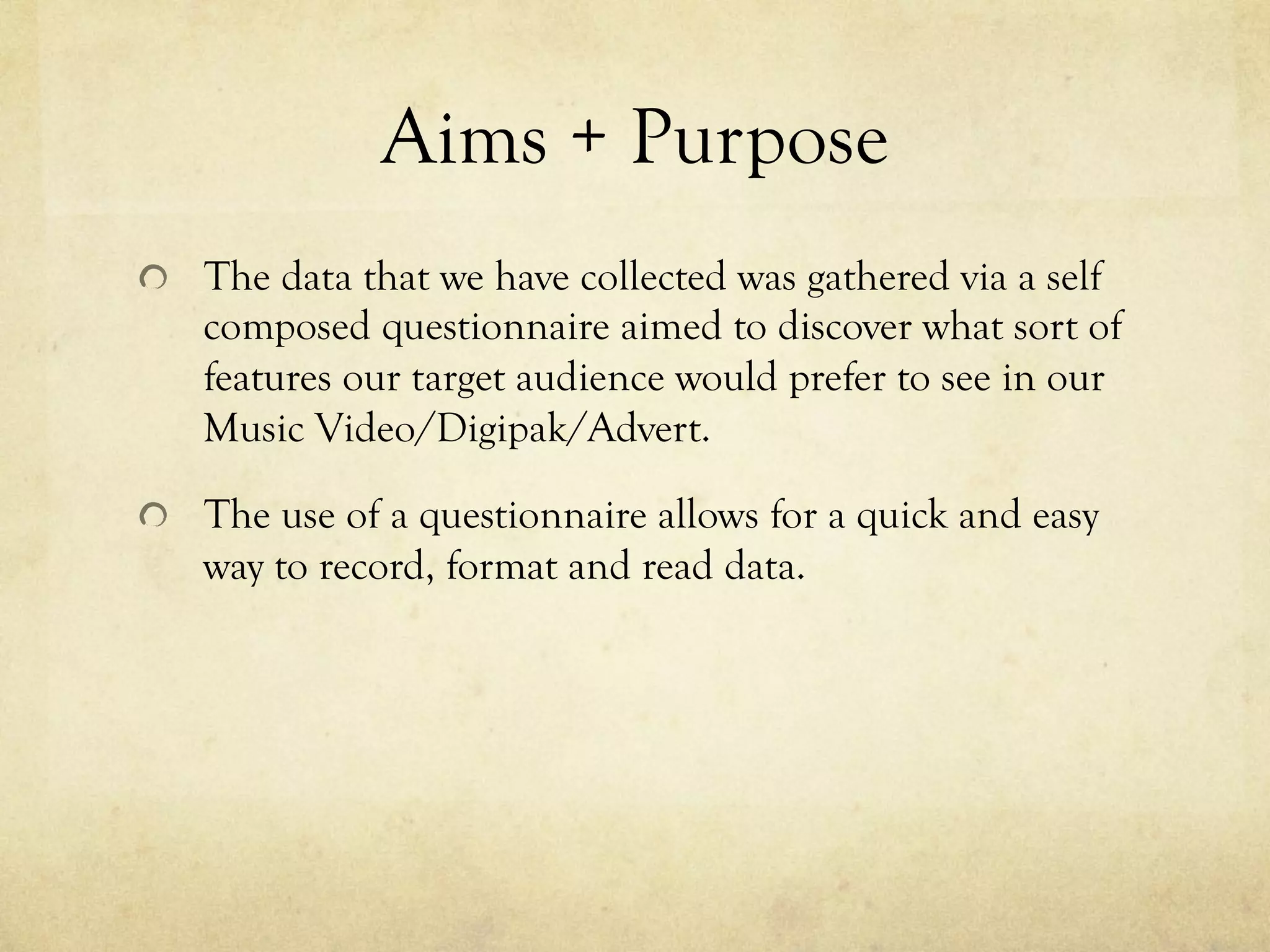 The document describes a music video questionnaire conducted to gather data on audience preferences. It found that the target audience is 21-25 year olds who work part-time. They prefer to watch music videos online and spend £2-£3 on music. Costumes and varied locations were favored for the video, while a film grain effect and formal text were preferred. Images with calm colors and imaginative artwork were liked for the album cover and advertisements.