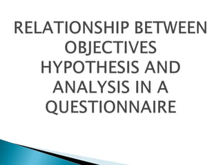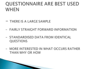 This document discusses the process of developing a questionnaire for research. It covers stages of questionnaire development such as exploratory interviews, pilot testing, and pretesting. It also discusses different types of questions, question formats, and guidelines for writing good questions. The document provides examples of good and bad question wording and explains concepts like mutually exclusive and exhaustive response categories. It then presents an example of using a questionnaire to study promotional methods, including developing hypotheses, collecting data, and analyzing results.