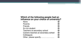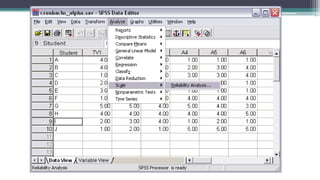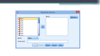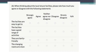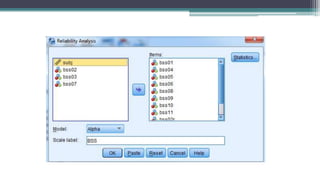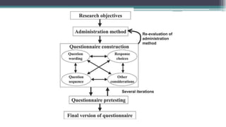 This document provides guidance on developing and analyzing questionnaires for surveys and research studies. It discusses key steps in questionnaire development including deciding what information is needed, defining the target respondents, choosing a method to reach respondents, developing question content and wording, ordering questions, pre-testing the questionnaire, and analyzing the data collected. Specific question types are also covered such as closed-ended, open-ended, ranking, and Likert scale questions. The document stresses importance of question clarity, avoiding biases, pre-testing questionnaires, and reliability and validity of measures used.