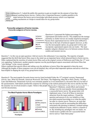 - Most respondents were between ages 13-18 or 19-24. Supernatural and slasher films were the most popular genres. Trailers, television, and cinema were favored viewing methods.