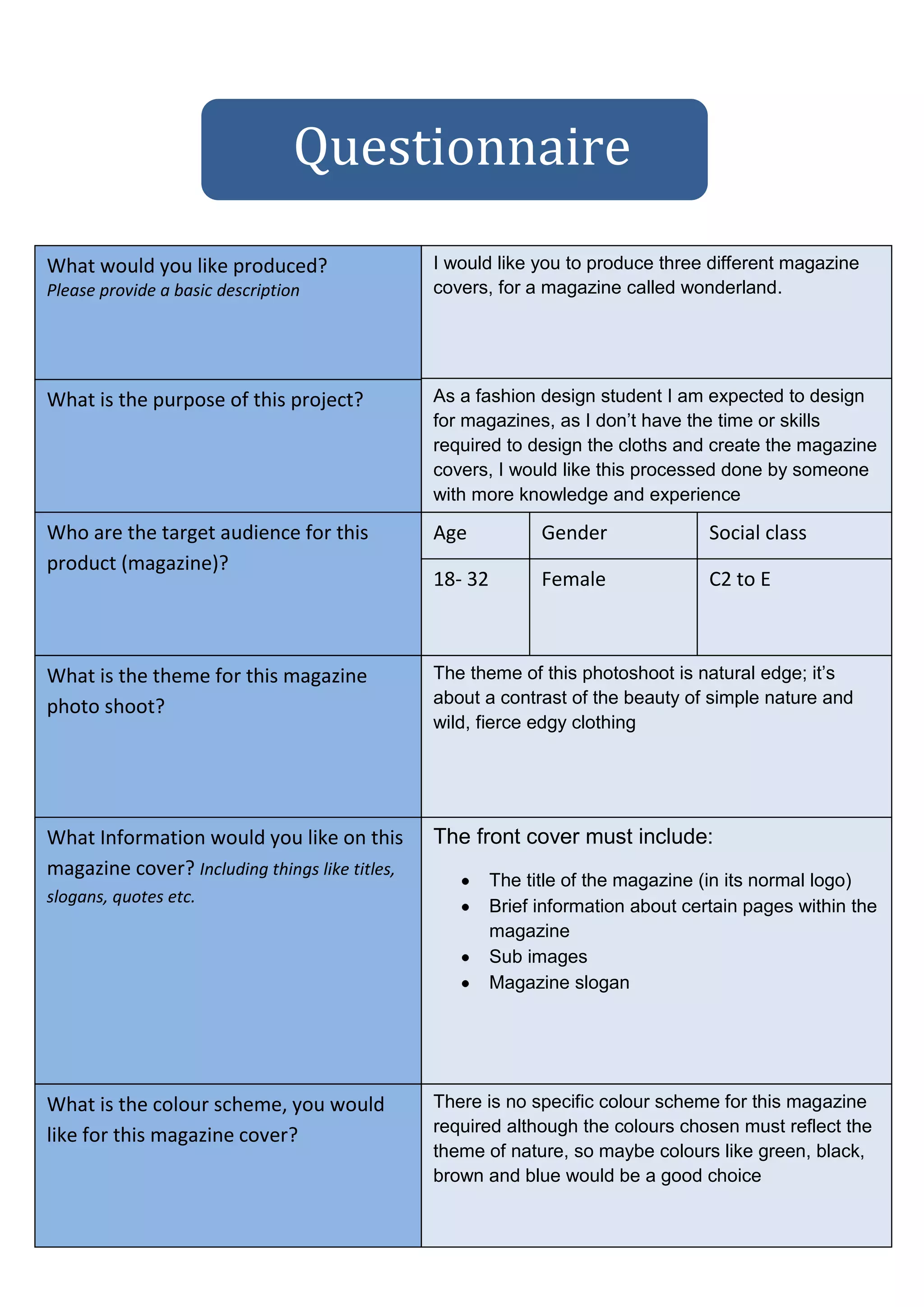 The document is a questionnaire for designing three magazine covers for a fashion magazine called "Wonderland". The target audience is females aged 18-32 in social classes C2 to E. The theme of the photoshoot is the contrast of natural beauty and edgy fashion. The covers should include the magazine title, information about pages, sub-images, slogan, and reflect nature with colors like green, black, brown, and blue. The first drafts are needed by March 20th and the final product by March 28th.