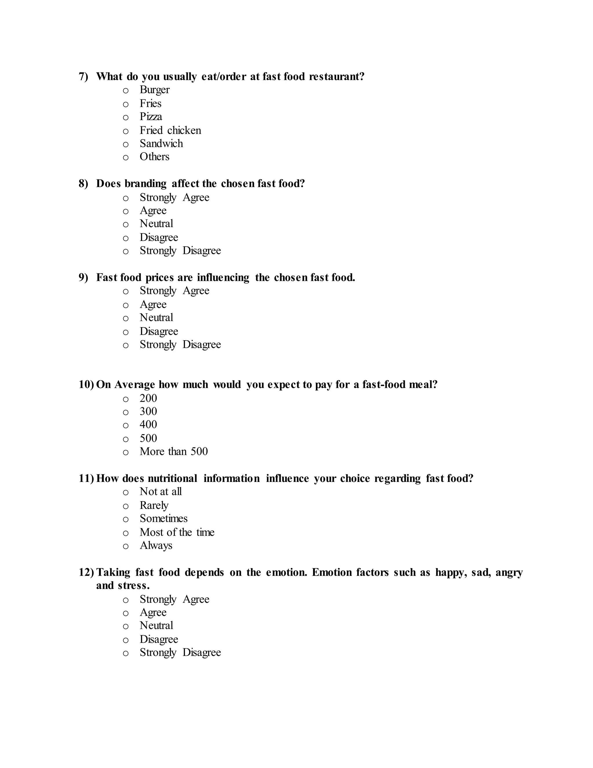 The 15 question questionnaire surveyed students at the Institute of Hailey College of Banking and Finance at Punjab University about their consumption of fast food. The questions covered topics like gender, age, frequency of eating fast food, what items they order, factors influencing their fast food choices like price and branding, awareness of nutritional information and health effects, and predictions about future trends in fast food consumption.