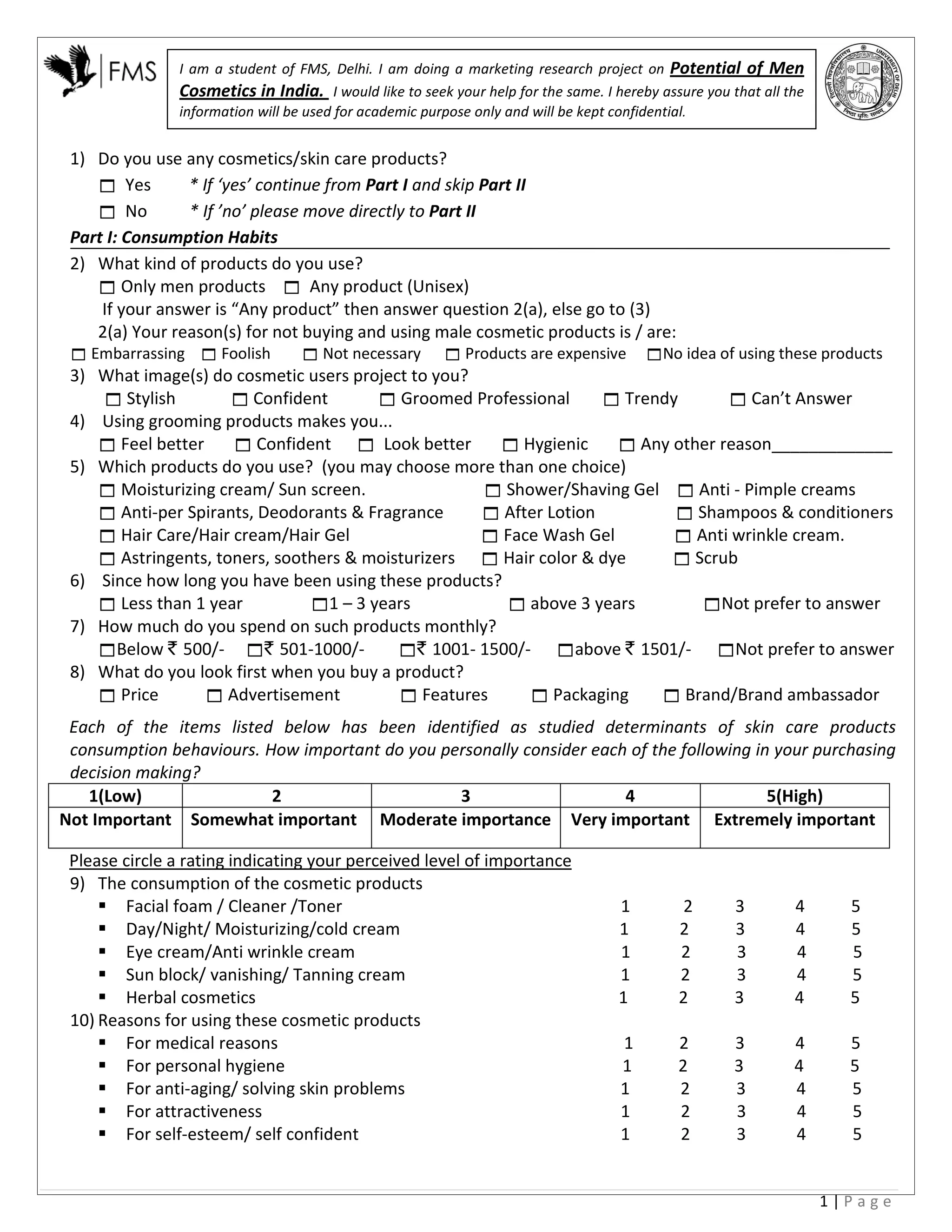 The student is conducting market research on the potential of men's cosmetics in India. They are seeking help to gather information through a survey. The survey asks questions about the respondent's consumption of cosmetic products, including what types of products they use, how long they have been using them, how much they spend, and what influences their purchasing decisions. It also asks non-users their reasons for not using cosmetics and what might affect their decision to purchase. All responses will be kept confidential and used for academic purposes only.
