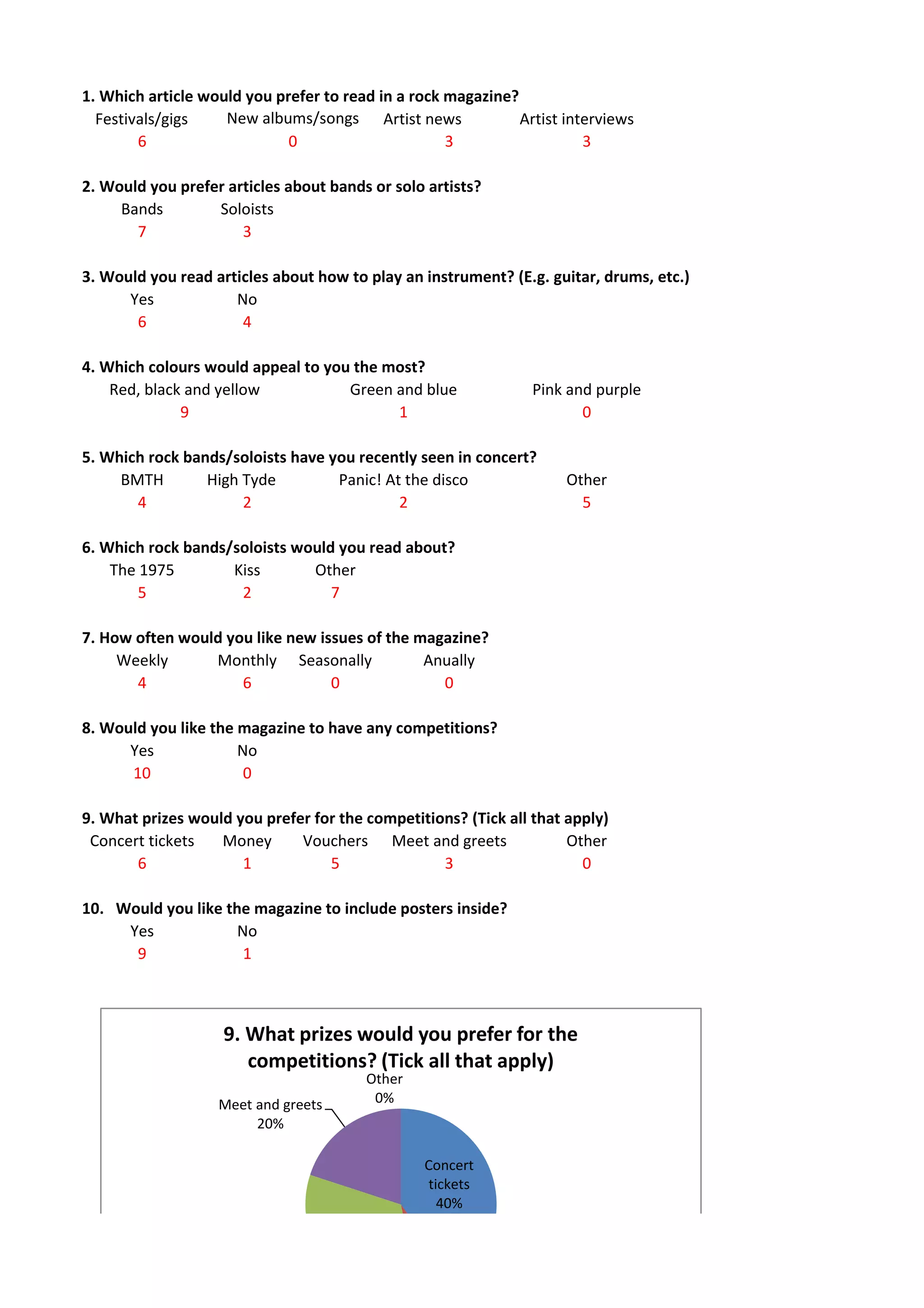 The document contains the results of a survey about preferences for a rock music magazine. It shows that festival/gig articles were the most popular choice. Bands were preferred over solo artists and most would read instrument lessons. Red, black and yellow was the most appealing color combination. Recently seen bands included BMTH, High Tyde and The 1975. Respondents wanted issues weekly or monthly and prizes to include concert tickets and meet and greets. Posters inside the magazine were also favored.
