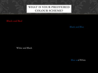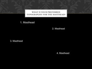 The document is a survey asking for preferences on color scheme, typography for a masthead, whether to feature a protagonist or antagonist on a book cover, which mood board best represents the thriller genre, the most used social media platforms, and where posters are mostly seen. It provides multiple choice options for respondents to select their preferences.