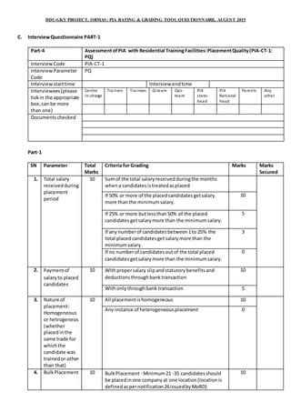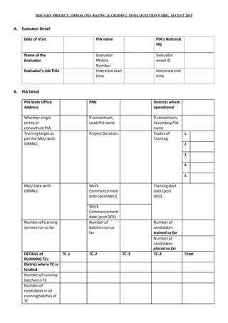 This document contains a questionnaire used to rate and grade Project Implementing Agencies (PIAs) involved in the DDU-GKY project run by ORMAS. It includes questions about PIA details, placement quality indicators like salary levels and placement percentages, and project execution quality indicators like achieving targets, financial reporting, and penalties. The questionnaire contains scoring criteria for parameters like placement percentage, timely completion, and money invested by the PIA in the project. It will be used to interview PIA representatives and evaluate performance on key metrics.