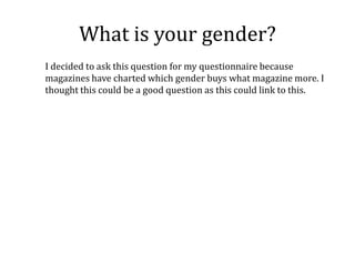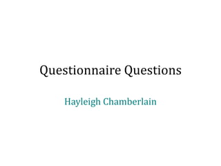 This document contains questions that Hayleigh Chamberlain developed for a questionnaire about readers' interests in indie music magazines. The questions aim to gather information on demographics (age, gender), music preferences (favorite bands, genres disliked), purchasing habits (magazines bought, amounts spent), and desires for magazine content (appealing covers, articles, styles). The questionnaire is intended to help design an indie magazine that will appeal to its target readership.