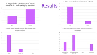 The document discusses a questionnaire conducted to gather public preferences for main characters. It includes 8 questions on topics like character gender, age, class, and favorite film characters. Graphs of the questionnaire responses show a preference for: an everyday female character from the city who is young, Carrie Bradshaw as a favorite character, Noah from The Notebook as a favorite male, similar ages for the male and female characters, a middle class female character and working class male character.