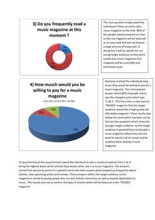 The document summarizes the results of a questionnaire conducted to inform the creation of a music magazine called "TRENDS." Key findings include: