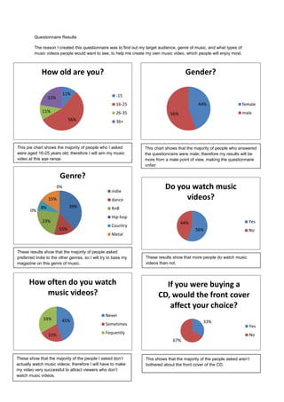 The document summarizes the results of a questionnaire about music preferences to help plan a new music video. The questionnaire found that the target audience is 16-25 year olds, most prefer the indie genre, and over 40% don't regularly watch music videos so the video will need to attract those viewers. The results were also biased towards male tastes so the video will need to appeal to both genders.