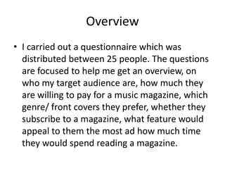 The questionnaire results showed that most respondents were males aged 16-21 who listen to rock music. They would be willing to pay £1-£2 for a music magazine and prefer magazine covers with color as the main attraction. The most appealing feature for subscribers would be articles about artists. Respondents said they would spend 30-60 minutes reading an issue.