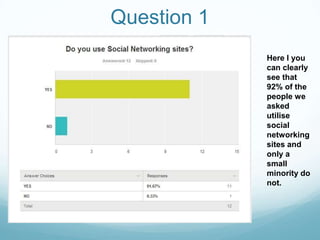 The document summarizes the results of a 10 question questionnaire about social networking usage. It found that 92% of respondents use social networking sites, most commonly Facebook and Twitter. The majority of respondents were between 16-21 years old. Most people use social networking to connect with friends and socialize rather than for business purposes. Attitudes towards social networking have changed since respondents were younger, shifting from gaming to connecting with others. The document also provides statistics on global social networking usage.