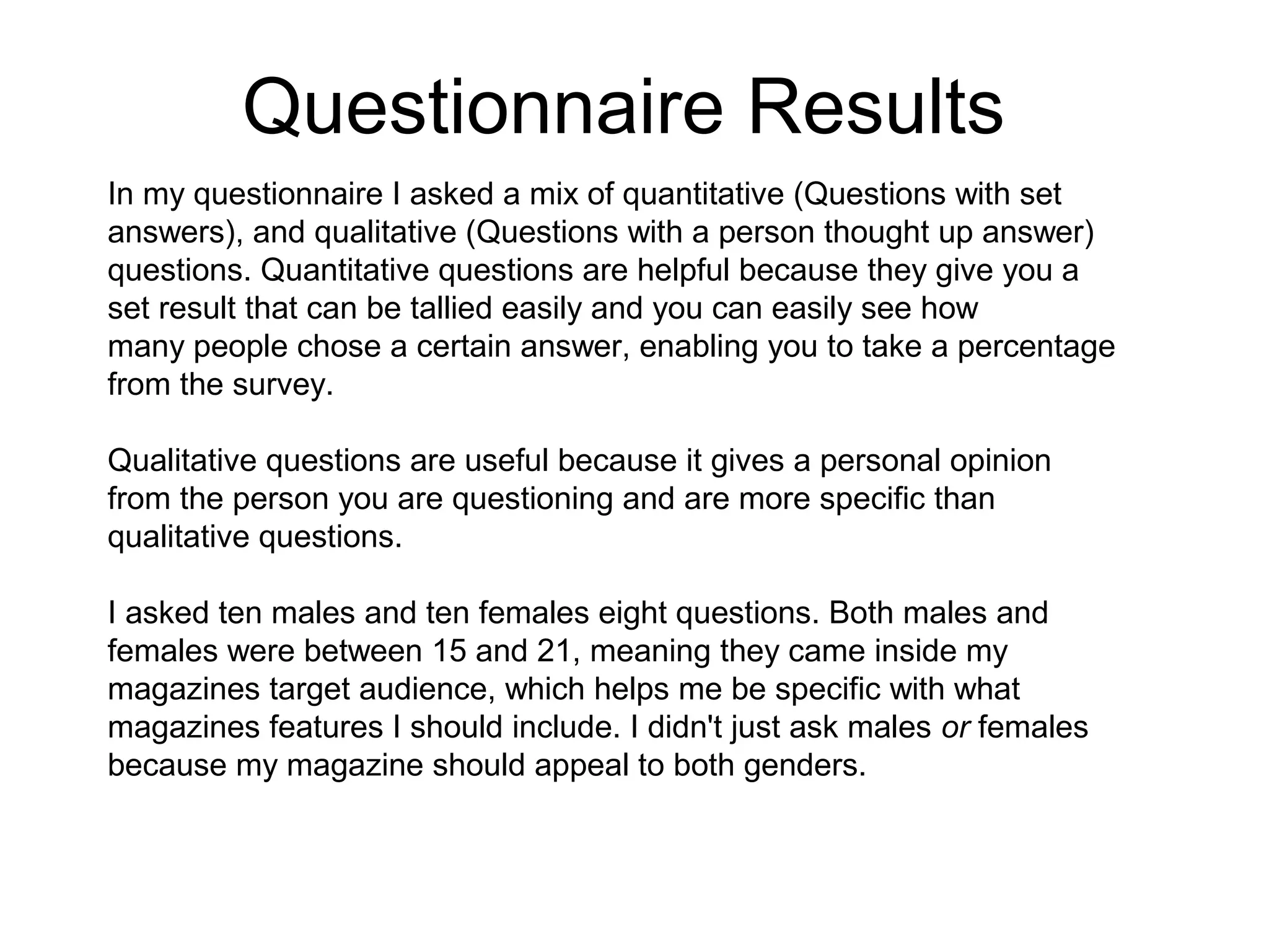 The document summarizes the results of a questionnaire given to 20 people between ages 15-21 about their music magazine preferences. Quantitative questions showed that genres like rock and pop were most popular, and people were willing to pay £2-3 for a magazine released weekly or fortnightly. Qualitative answers indicated readers want interviews, reviews, exclusives and posters. This provided ideas for the target magazine's pricing, release schedule, genres, and key content to include. The questionnaire successfully revealed what would motivate the target audience to read and purchase the magazine regularly.