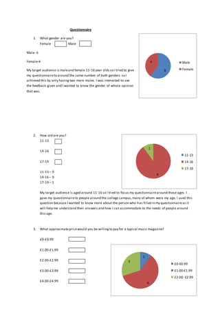 - The document summarizes the responses to a 12 question questionnaire given to 10 people (6 male and 4 female) between the ages of 14-19 about music magazines.