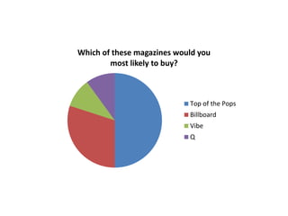 This document contains a survey about magazine audience preferences, asking respondents which magazines they would buy, their preferred magazine masthead, best cover images, importance of a website, favorite article types, ideal color schemes, cover images that encourage purchase, and desired contents page sections. The survey gauges reader interests to help design an appealing new pop music magazine.