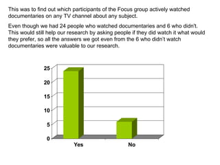 The document summarizes the results of a questionnaire given to 30 people to help plan a documentary project. Most participants, 24, watched documentaries on TV. While voiceovers were the preferred narration style, scientific documentaries were the most popular genre. The majority, 24 people, wanted expert opinions included and preferred a overarching quest narrative.