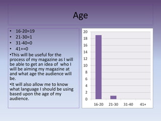 The document contains the results of a questionnaire about music magazine preferences. It shows that most respondents were between 16-20 years old and female. The majority listened to rock music and their favorite rock bands included Muse, Fleetwood Mac, and Arctic Monkeys. When describing rock music, common words used were loud, heavy, and cool. Most respondents never buy rock magazines or would only buy one every month. They prefer magazines with pictures over text and would pay between £2-£4 for a magazine. The most expected photo type on the front cover is a midshot. This information will help guide decisions about the target audience, content, and design of a new rock music magazine.