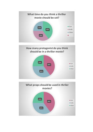 This questionnaire asked respondents about their preferences for thriller movies. Most respondents preferred gun thrillers to knife or other genres. The top main topics were forests at 50% and abandoned buildings at 25%. The most related locations to thrillers were also ranked as gun, knife, and other. The preferred time for a thriller movie was ranked as gun, knife, or other. When asked about the number of protagonists, gun, knife, or other were again the top answers. For props in thrillers, gun and knife once more ranked above other options.