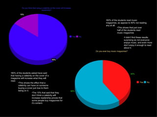 Most people buy magazines on a monthly basis due to magazines typically being published monthly rather than weekly. A survey found that images are the main focus of music magazine covers, followed by color and font, and that having a celebrity on the cover increases the likelihood that students will read the magazine. While 60% of students surveyed read music magazines, 15% said a celebrity would not impact their decision to buy an issue, showing that some consumers focus on content over celebrities.