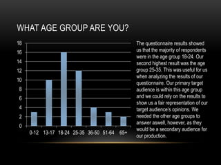 The questionnaire results showed that the target audience for the short film was 18-24 year olds, with most respondents having a university degree. They enjoyed horror films rated 8/10 and watched them weekly or monthly. Tom Hiddleston was the most popular choice to play a psychiatrist in a horror/thriller, and respondents preferred supernatural and psycho killer elements in films. Their favorite trailer was Silence of the Lambs, and most liked thriller and drama subgenres. The results informed decisions about the film's plot, characters, and genres to appeal to the audience.