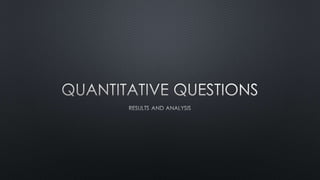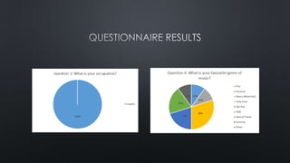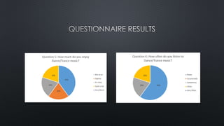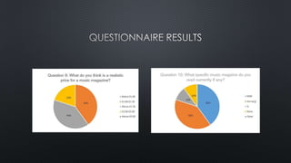 The document discusses a questionnaire given to 4 males and 4 females ages 16-18 about a dance/trance music magazine. It used both quantitative questions with set answers and qualitative questions requiring opinions. Quantitative questions clearly showed how many picked each answer, while qualitative questions provided more detailed responses. The questionnaire aimed to determine what the target audience of 16-18 year olds thought about certain music magazine aspects. It included equal numbers of both genders and a mix of ethnicities to make the results as diverse as possible.