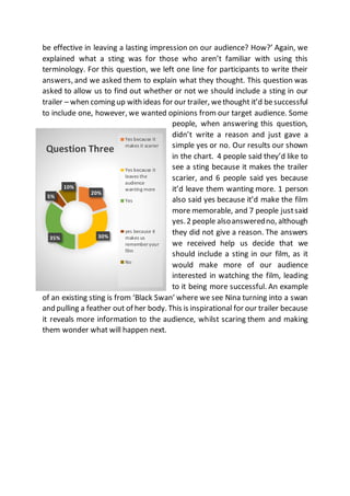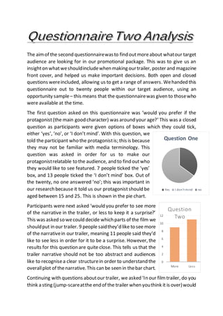 The second questionnaire aimed to gather insights from a target audience regarding preferences for a promotional package, including trailers, posters, and film magazines. Responses indicated that the protagonist should be relatable, the trailer should balance narrative reveal, and include music, with a preference for horror elements like jump scares. Additionally, preferences on poster content and magazine pricing suggested a clear focus on engaging visuals and accessible pricing for effective audience attraction.