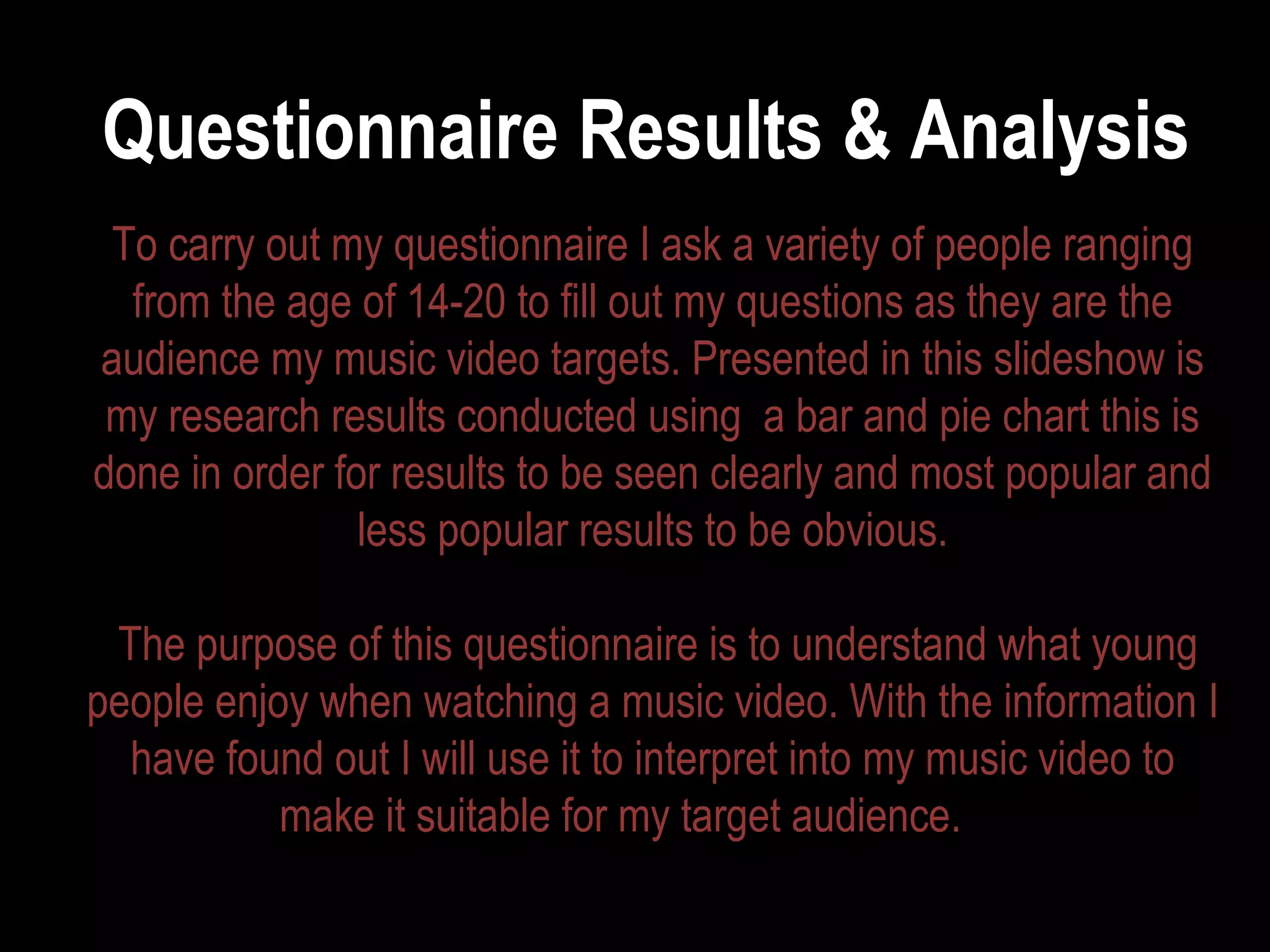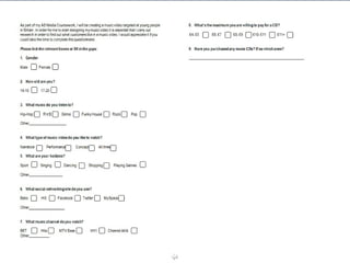 The document summarizes the results of a questionnaire given to people ages 14-20 about their music preferences to help inform the creation of a music video. The questionnaire found that R&B was the most popular genre over pop, and that MTV Base was the most watched music channel. Most respondents said they preferred narrative music videos. When asked how much they would pay for a CD, the most common response was £10-£11.