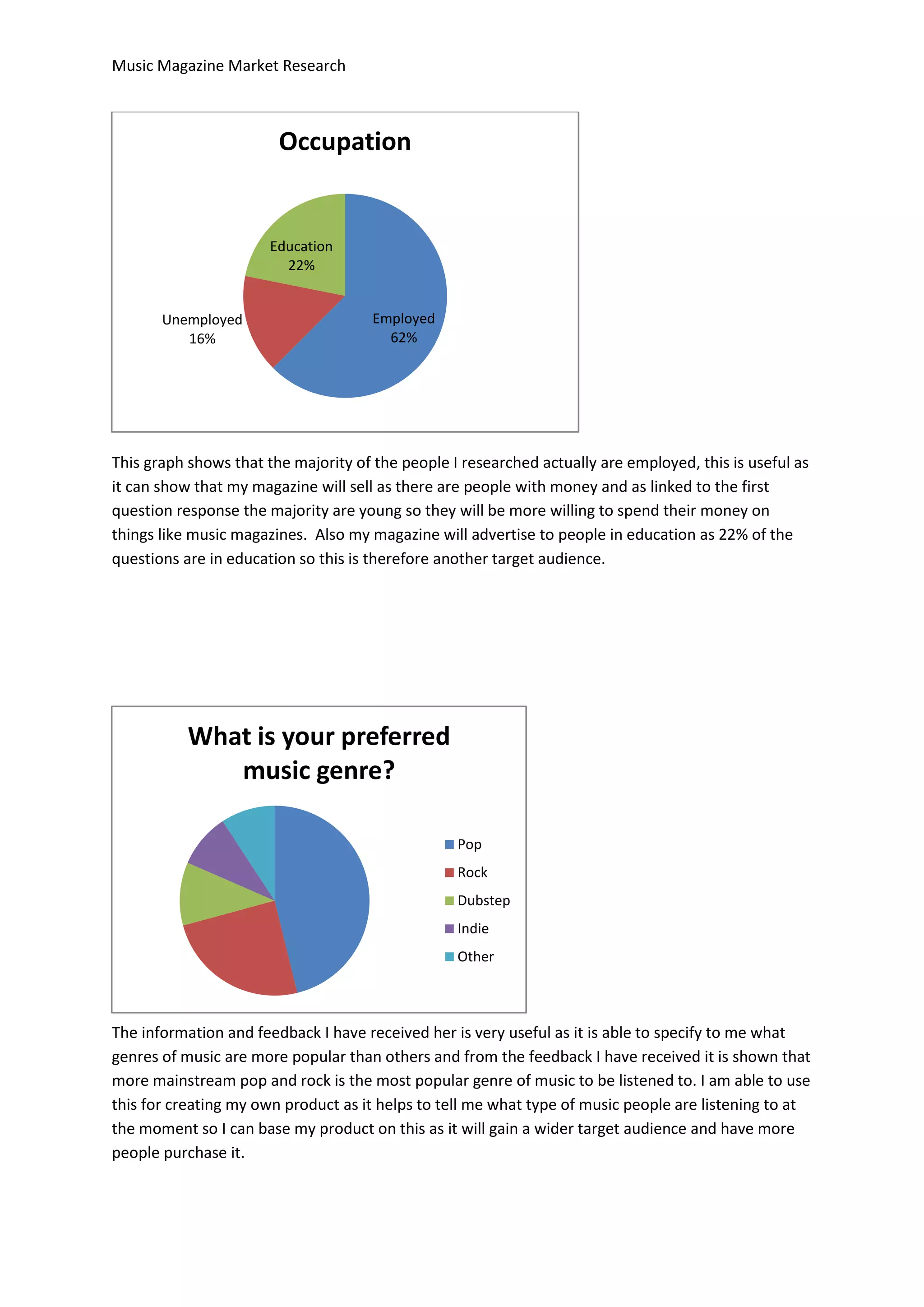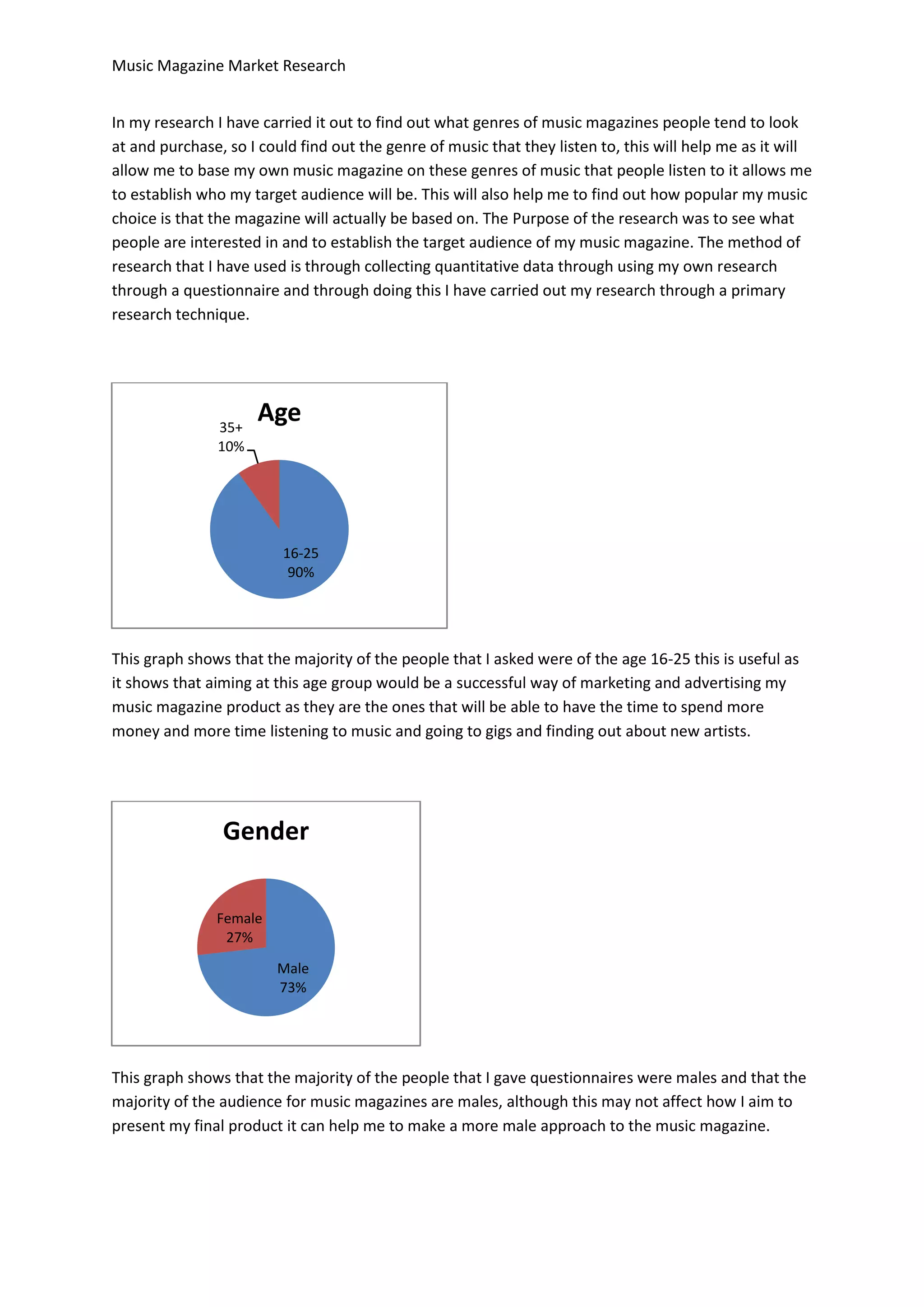 The document summarizes market research conducted to help determine the target audience and genre focus for a new music magazine. A questionnaire was used to collect quantitative data on respondents' music preferences, spending habits, and demographics. The results showed that the majority of interested readers are males aged 16-25 who listen to pop and rock music and are willing to spend under £4 on a magazine. This information will influence the creator to aim their magazine at younger music fans and focus on popular genres like pop and rock.