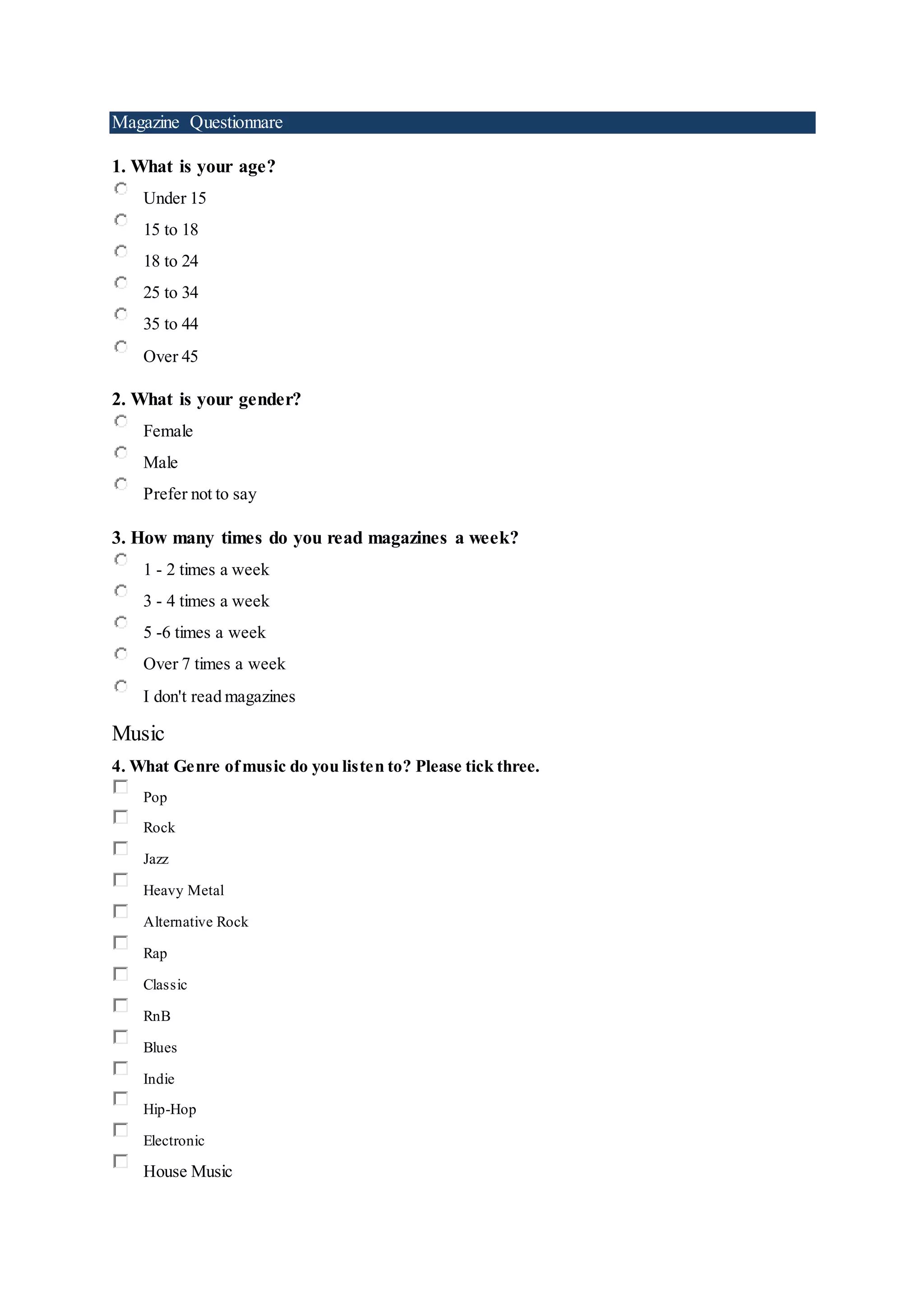 The document is a magazine questionnaire that asks respondents about their demographics, music preferences, magazine reading habits, and music spending. It collects information on the respondent's age, gender, magazine and music streaming frequency, music genres listened to, time spent listening to music daily, magazine reading frequency, print vs. online preferences, music spending amounts, and preferred competition prize types. The questions include multiple choice and checkbox options to select responses.