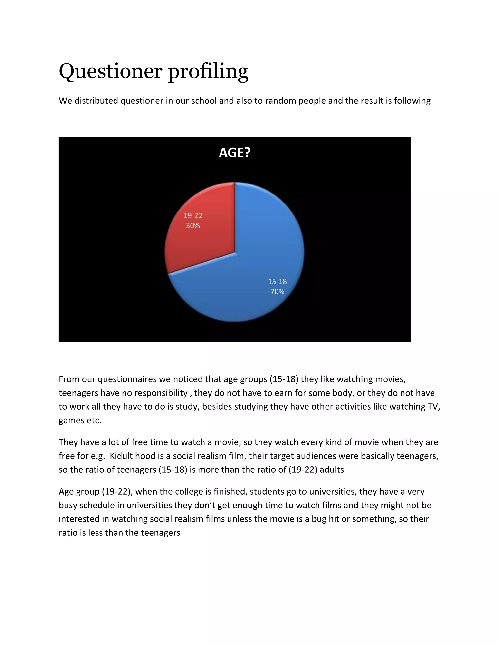 The document discusses the results of a questionnaire about viewership of social realism films among different age groups, genders, and themes. It finds that teenagers aged 15-18 are more likely to watch such films than young adults aged 19-22. It also finds that females are more likely to watch social realism films than males. However, in general social realism films do not have wide appeal and struggle to find an audience unless they are big hits. Themes around child labor, abuse, drugs, culture and domestic violence are most common in social realism films.