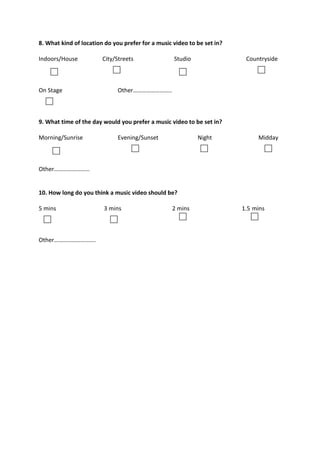 This document contains a 10 question survey about music listening habits and preferences for music videos. It asks about the respondent's gender and age, their favorite music genres and artists, where and when they typically listen to music, and their preferences for music video settings, times of day, and durations. The questions seek to understand demographics and get a sense of the respondent's tastes in music and what they look for in music videos.