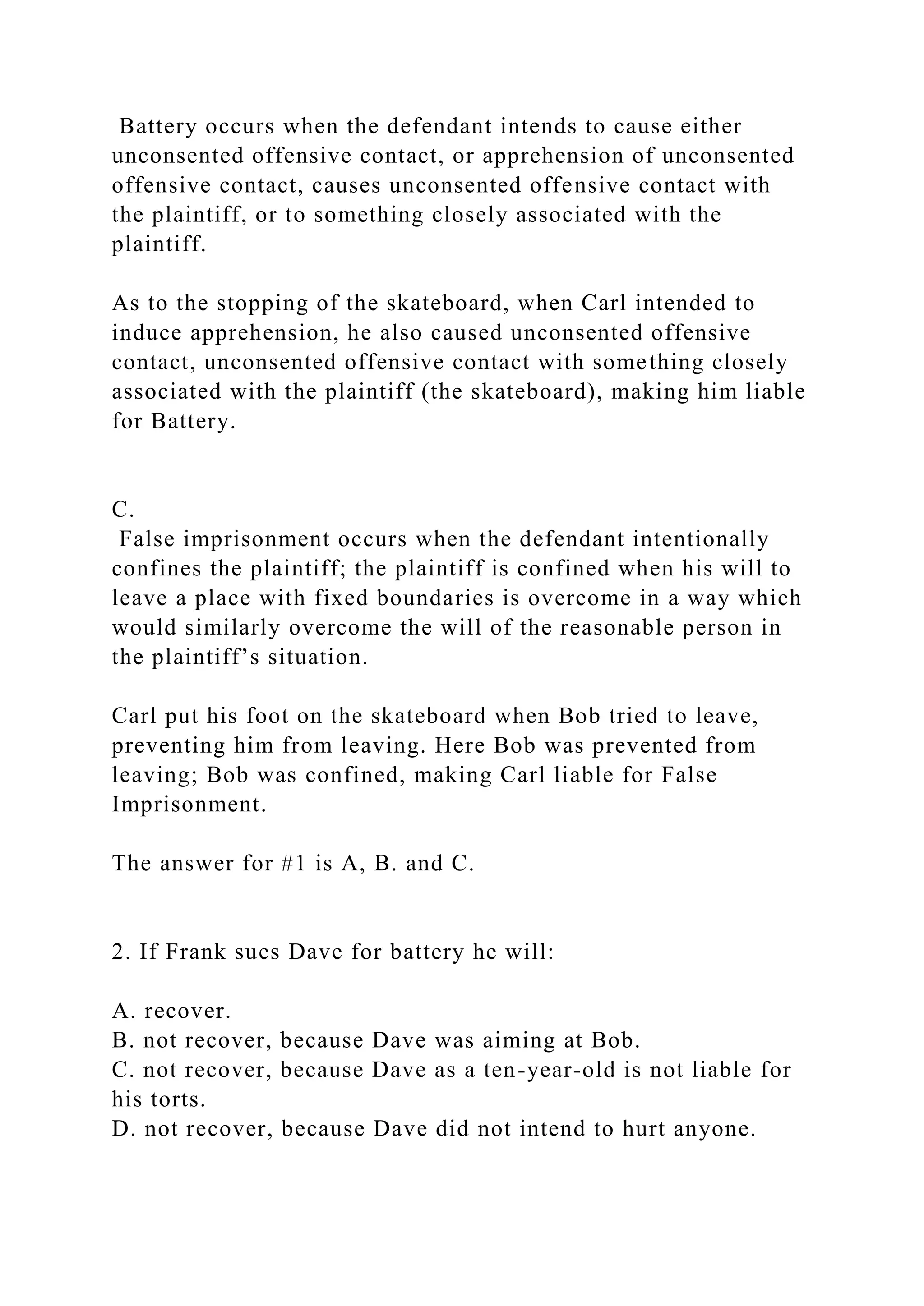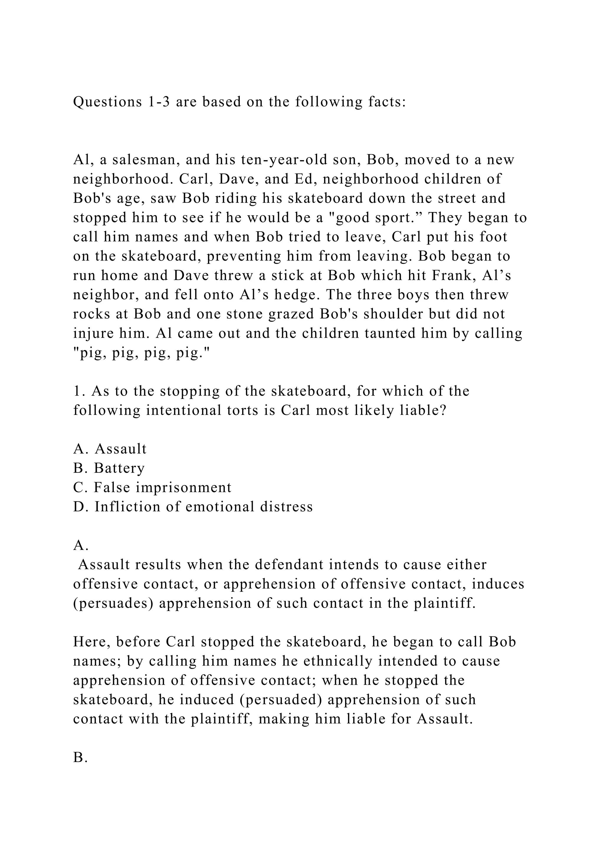 The document outlines a series of legal scenarios involving intentional torts such as assault, battery, and false imprisonment, detailing actions by various individuals including neighborhood children and adults. It explores specific incidents and their legal implications, such as the liability of children for their actions and the consequences of practical jokes. The document presents hypothetical lawsuits and discussions about recovery for injuries and emotional distress resulting from these actions.
