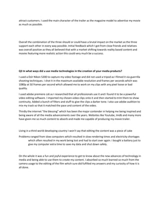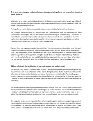 The document summarizes the creation of a movie trailer for a class project. It discusses conventions used in existing trailers that were followed, such as length and inclusion of scenes to generate curiosity. It also discusses conventions that were broken, such as limited dialogue and realistic portrayal of a forbidden love story. The trailer was inspired by techniques from filmmakers like Tarantino and used black and white sequences as homages. Ancillary tasks like a movie poster and magazine ad were created to promote the trailer. Various media technologies were used, including a DSLR camera, Adobe Premiere and After Effects for editing, and internet resources for research and inspiration. Challenges included slow computer speeds and power outages.