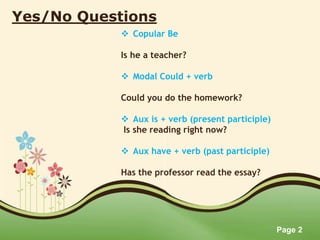 The document discusses different types of questions in English, including yes/no questions, tag questions, and Wh-questions. It provides examples for forming questions using auxiliary verbs, subject-verb inversion, and question tags. The types of Wh-questions covered include what, who, when, where, why, how and whose questions. Embedded questions, information questions, repeat please questions, and elaborate please questions are also discussed.