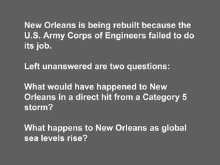 The document discusses the failures in rebuilding New Orleans after Hurricane Katrina, emphasizing the risks posed by future hurricanes and rising sea levels. It compares the vulnerabilities of various locations, including New York City and Miami Beach, to natural disasters exacerbated by climate change. The text advocates for improved disaster preparation and a national risk atlas due to the increasing threat from environmental hazards like earthquakes and wildfires.
