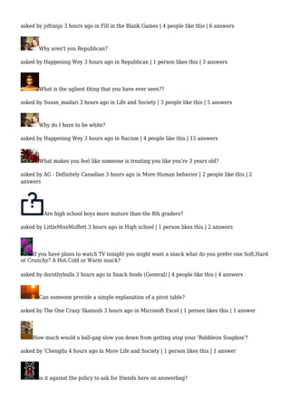 The document consists of a series of questions posted by users on Answerbag, covering various topics such as personal relationships, societal issues, politics, health care, and pop culture. Many questions have received few or no answers, while others have garnered likes and a small number of responses. The variety of questions reflects diverse human experiences and curiosities, emphasizing a range of social interactions and opinions.