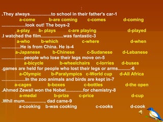 The document contains multiple choice questions about parts of speech, grammar rules, and English language concepts. It tests knowledge of topics like verb tenses, subject-verb agreement, parts of speech, word classes and sentence structure. The questions cover a wide range of grammar and language topics for an English proficiency exam.
