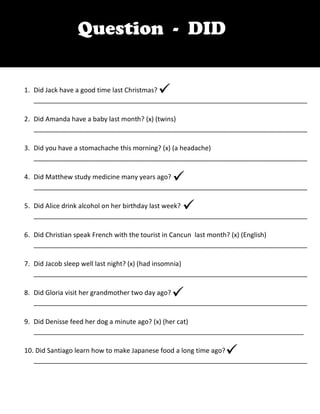 The document consists of a series of questions regarding various individuals' activities and experiences, with several questions indicating answers that do not match the expected or common response. The questions cover personal events such as childbirth, celebrations, and daily routines. Several entries include notations of incorrect or alternative answers in parentheses.