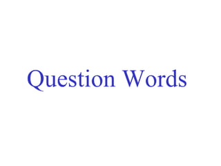 This document discusses question words used in language arts and provides examples of 5 common question words - what, where, when, why, and how - and a sample sentence for each. It asks the reader to think of 5 question words and then provides the words what, where, when, why and how as examples, following each with a short sentence using that question word to demonstrate its use.